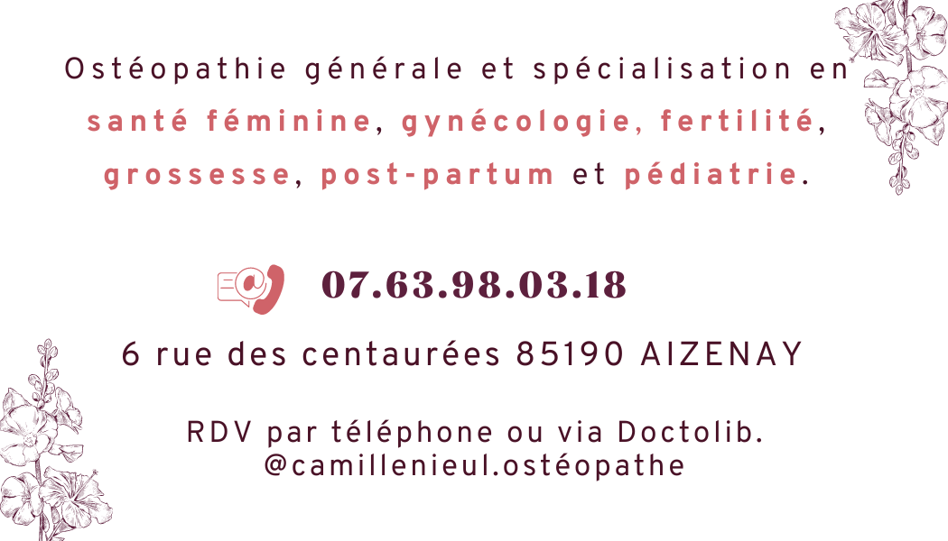 Je suis Camille NIEUL, ostéopathe diplômée en 2018 à Nantes et installée à Aizenay (85) depuis 2023.